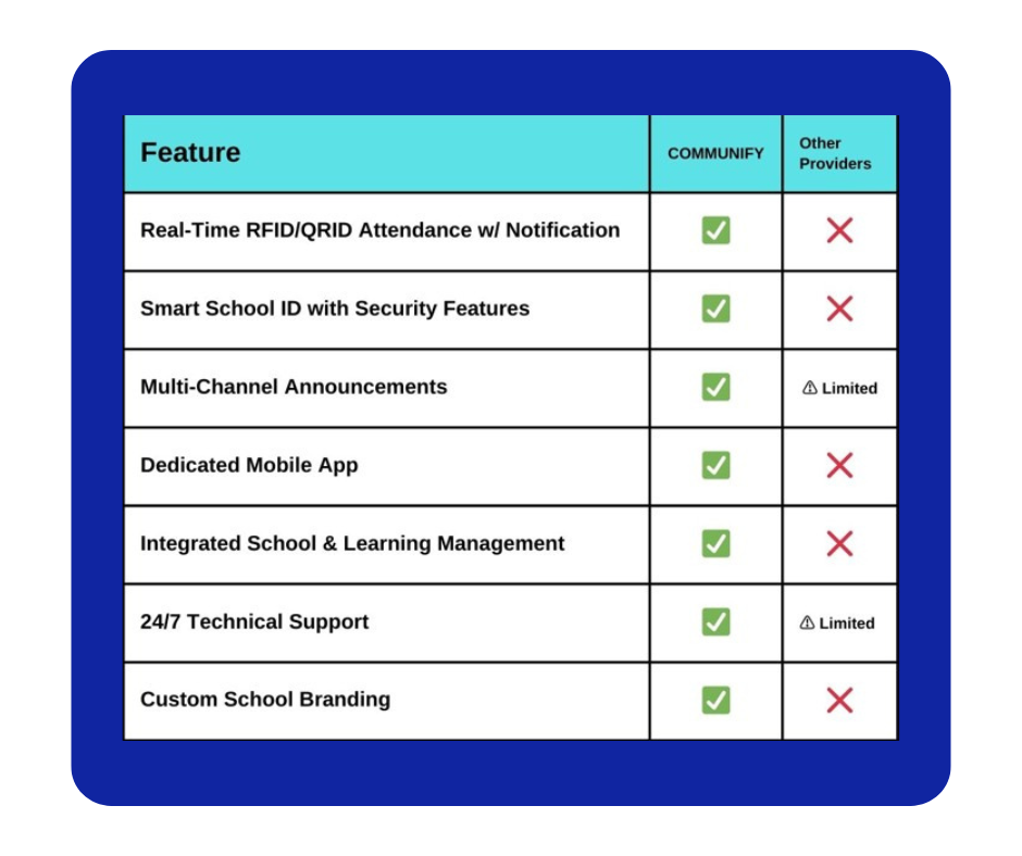Unlike other solutions, COMMUNIFY offers a truly integrated platform combining communication, attendance tracking, school management, learning management, and security — all in one system. Here’s how we stand out.