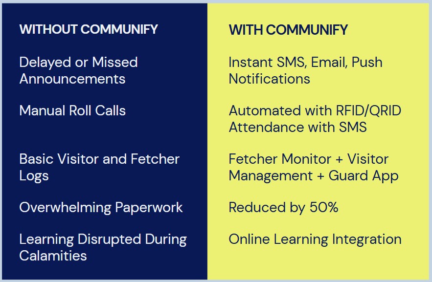 COMMUNIFY is an all-in-one school ecosystem designed to revolutionize communication, safety, and school management. It combines powerful modules—like RFID/QRID Smart Attendance, automated SMS/email notifications, mobile apps, School & Learning Management Systems, and visitor control—into a single, seamless platform. Built for speed, security, and scale, COMMUNIFY empowers schools to stay connected with parents, engage students, and operate more efficiently than ever before.